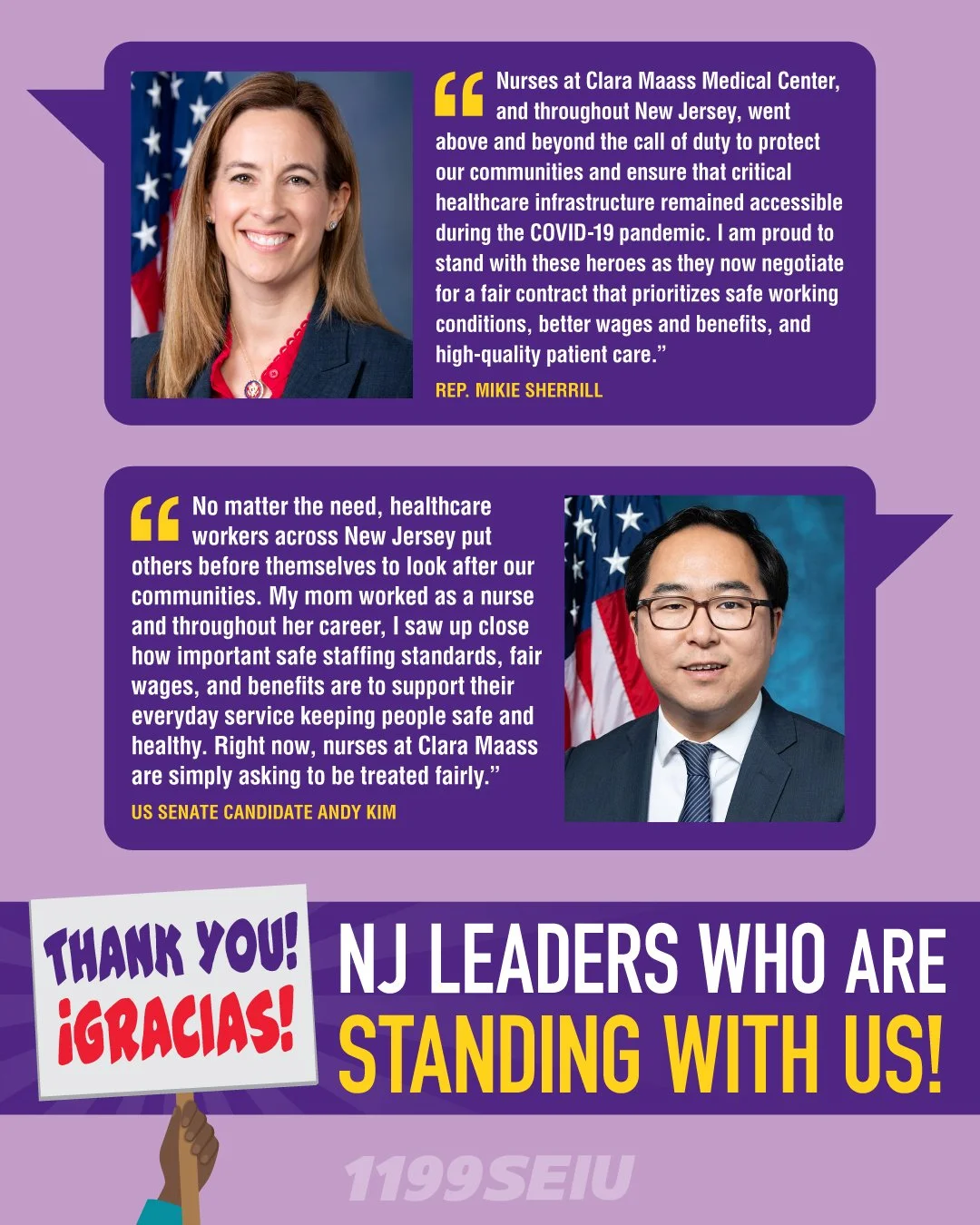 Our community stands united in support of Clara Maass nurses’ efforts to achieve safe staffing, quality patient care, and improved working conditions in their hospital. We urge hospital management to bargain in good faith with the nurses.